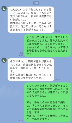 ずっと「自分が悪い」と思い込んで、人間関係に疲れていました。LINEで少しずつ気持ちを話していくうちに、「私にもちゃんと気持ちがあるんだ」と思えるように。